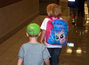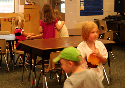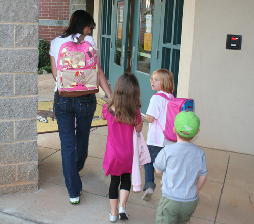 We got lucky and found parking up close (starting Monday Denis will be going through the “drop off” lane and simply letting her go in by herself). As we got near the doors we found Amy and Emma just across the way, so we all made the long walk together. I could see that Emma was VERY sad about going to school (her mom works from home so Emma has the benefit of staying at home most of the time rather than being in daycare all day like my kids). CootieGirl, on the other hand, was leading the way and rarin’ to go. In fact, when we got to her class she showed me where to put her backpack and with a nary a word went off to go play.