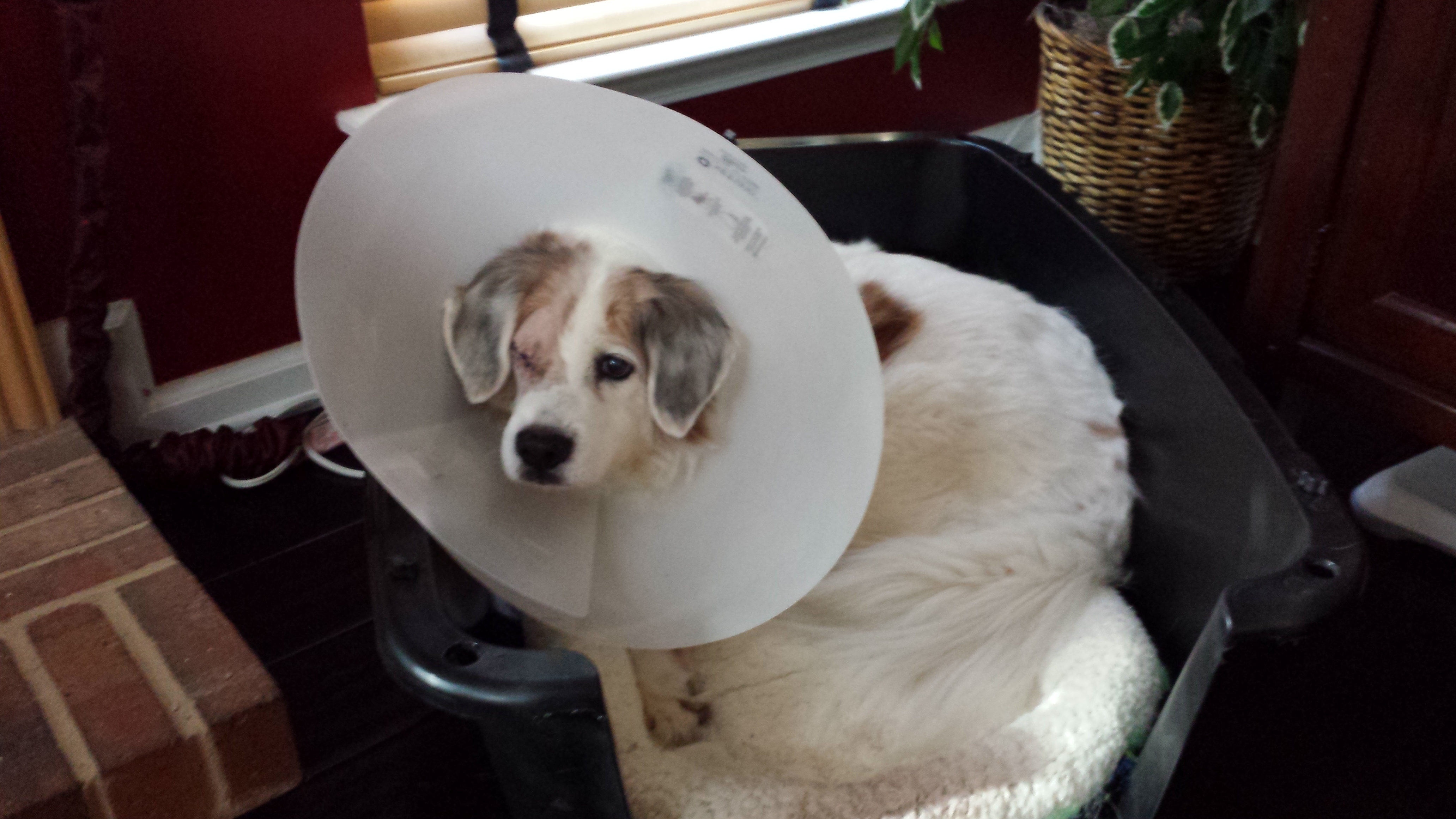 Chilly on Sunday afternoon, suffering only from the ignominy of the Cone of Shame: