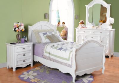 The picture shows the twin bed, but I’d get the full size since that’s the size bed she has. The pros to this bedset is that while it is very girly, it can still accommodate a teenager because it’s not CHILDISH (a la the Disney bedroom sets featuring the princess bows and tiaras that any smart pre-teen would abhor). So even when CootieGirl and I paint over her princess mural when she’s 11 or 12 years old she can keep her furniture and still have a cool teenager room.