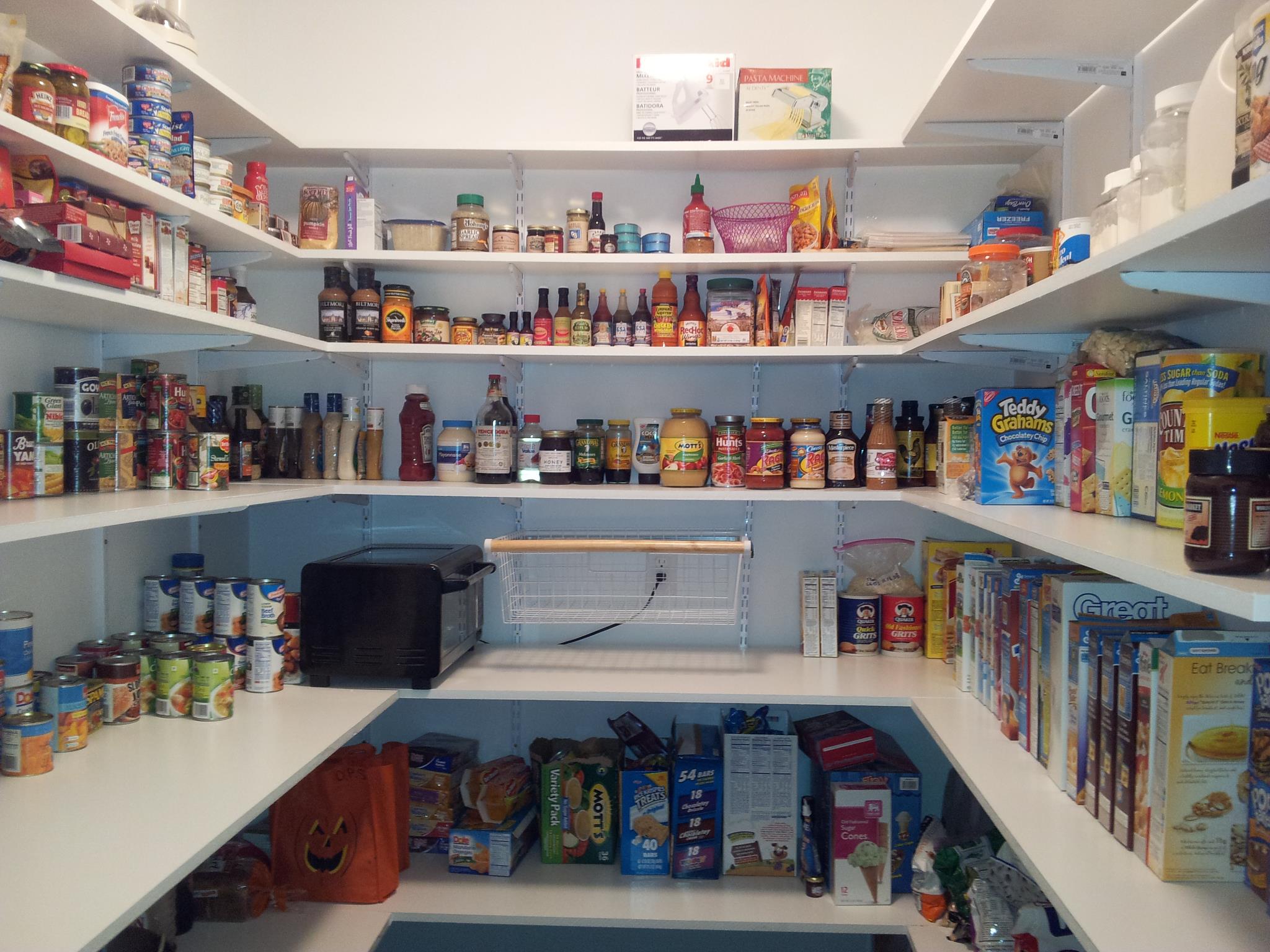 The pantry is great, but it’s taking us time to figure out just how to organize it and get everything in there. It’s not as easy as “put things on the shelves.” The basket in the picture is not staying there – that’s a test run to make sure it would work with our bracket system (it does, obviously). Our intention is to put two shelves side-by-side under the lowest shelf on the left side of the pantry. We’ll put all the kids’ lunch snacks and sides in those baskets. And yes, we have a lot of cereal – for a while the sales were so good I was getting them for $1 a box, so we’ve got a bit of a stockpile going.