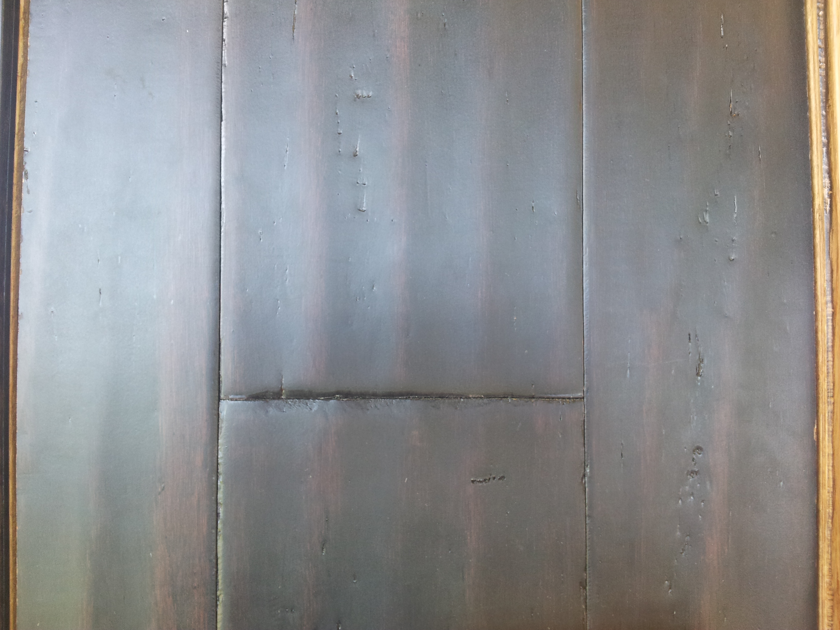 In the picture the planks look very brown, but in person and laying on the ground, even in full sunlight they look closer to black, with just a hint of brown streak in them. They are gorgeous. And we love that they are distressed so that if we DO scratch them, it’ll look like it was supposed to be there! *lol*
