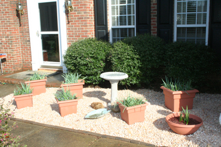 Denis wanted to go to the grocery store, so he agreed to pick up more river rock. While he was gone I brought my flower containers to the front and arranged things the way I wanted. Then upon his return (with 10 more bags) we laid out the rest of the river rock.