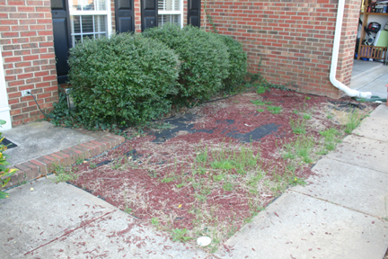 Isn’t it awful? The original owners had English ivy there, which I can’t understand. Who puts ivy in a garden bed right next to their house? Not me! When we ripped it out we laid down fresh weed barrier and rubber mulch, which was ridiculous. The mulch would blow all over the place in a rainstorm, and the weed barrier was more like a weed cultivator. As you can see.