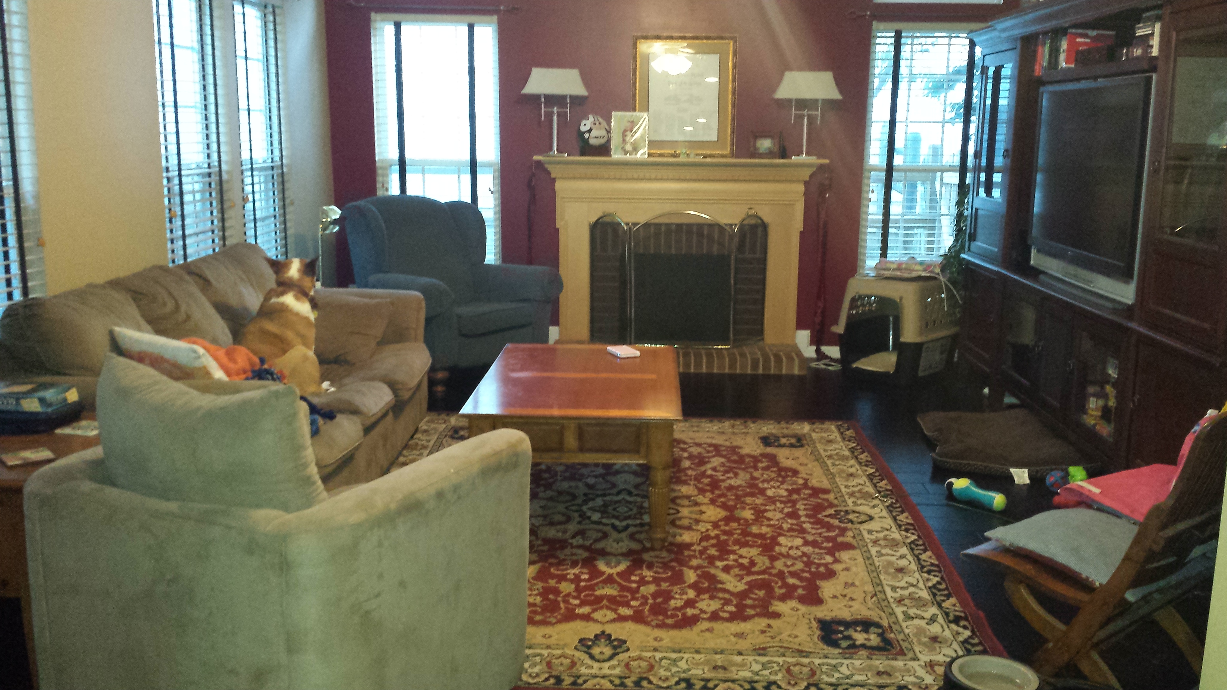 We’re in the process of having our TV room carpet replaced with hardwoods. Well, by the time this post goes live it’ll be done. Right now it looks like this: