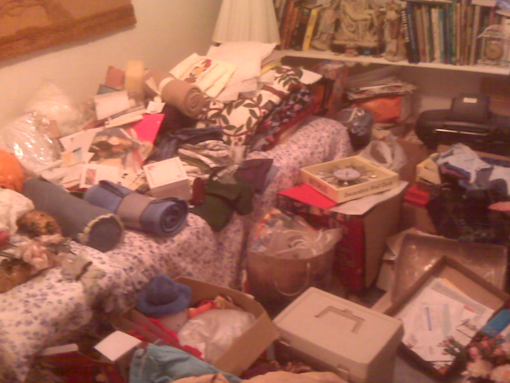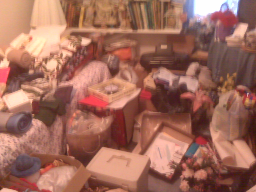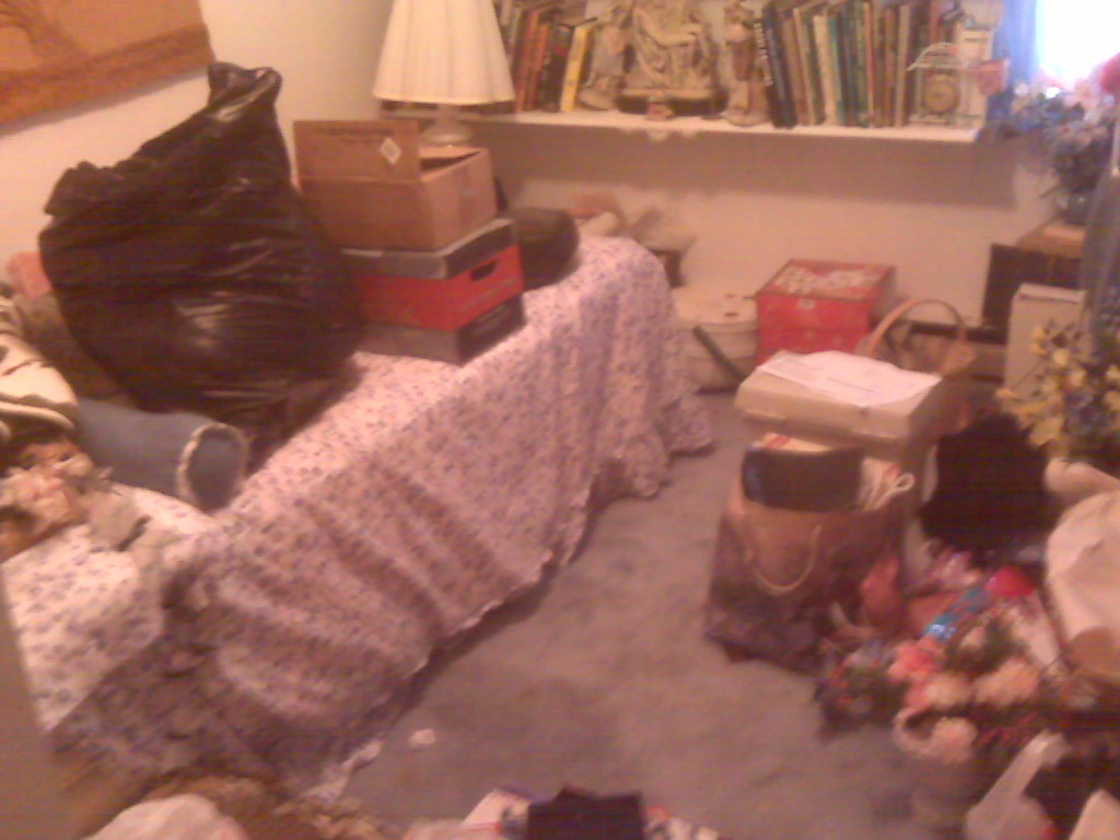 I stayed for a couple hours, and then opted to go check into the hotel and get a good night’s sleep in preparation for Friday. Â We got started about 8:30 a.m. Â Once I truly took stock of the house, I had no idea where to begin. Â I opted to pack up some of her Blue Willow in the kitchen, as well as some knick knacks she had on the shelves. Â Once I got that done, I decided to do some work in her second bedroom. Â When I opened the door to the room, this is what I saw: