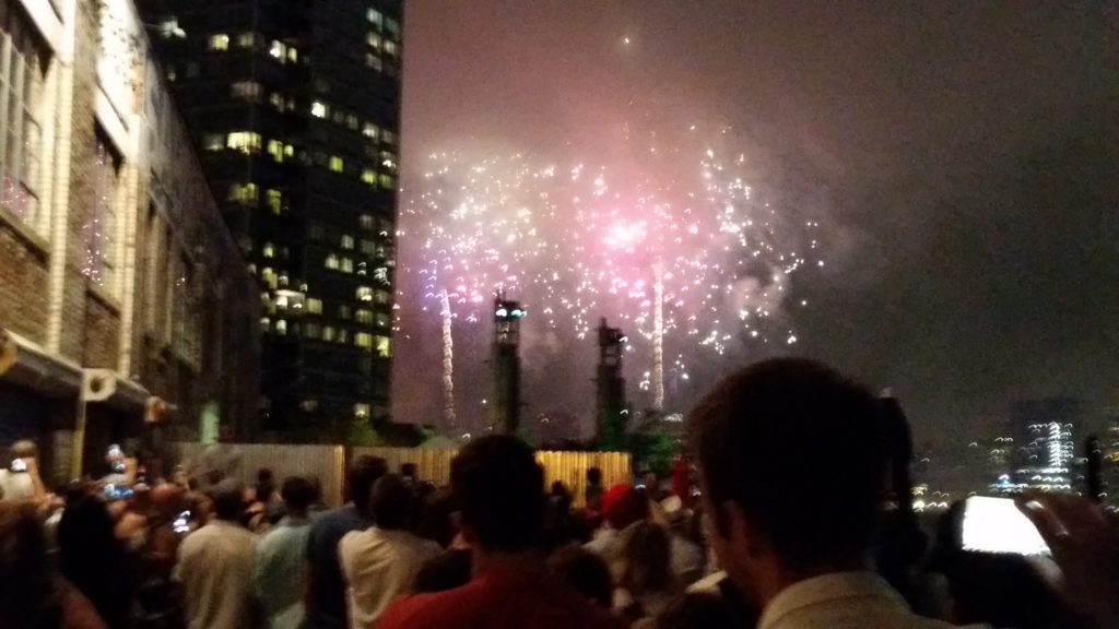 And suddenly, after a few more minutes, the nearby skies lit up with fireworks. And just like that, the drama of the outdoor restaurant, the rain, the lack of sweatshirt, the initial lack of seating – it all went away and the four of us stood and took pictures, and recorded video, and ooh’d and aah’d over the fireworks that were on display. Of the four barges in the East River, we could see the fireworks from two of them, and the restaurant DJ put on some dance music for us to listen to while they went on. The kids declared the fireworks awesome, and there were many we liked that we had never seen before.