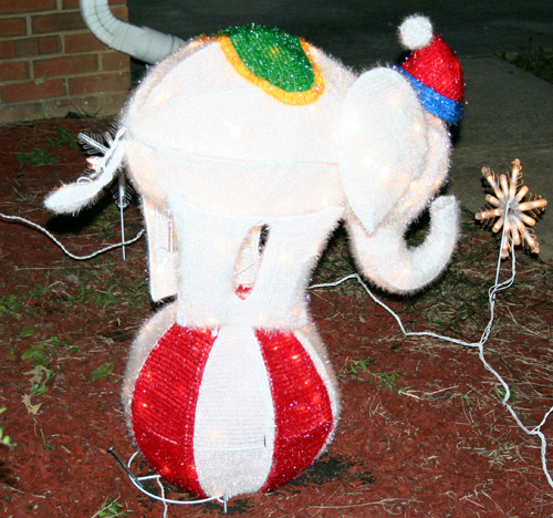 We also put up the miscellaneous Christmas things we’ve collected over the years and put them throughout the lower floor of the house. Denis put up the net lights on the shrubs outside our house – we’ll need to get a few more of those today though, because some went out and we have three more shrubs to cover. The awesome thing we set up yesterday is a new addition. A LIGHTED WHITE ELEPHANT! It’s awesome! We bought it at a post-Christmas sale last year and it’s perfect. We also put flashing snowflake lights around it, like it’s in the center ring at the circus.